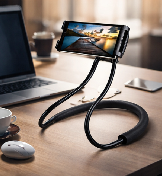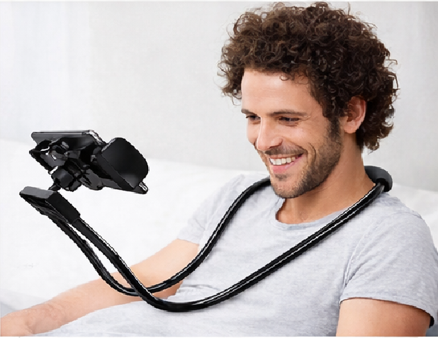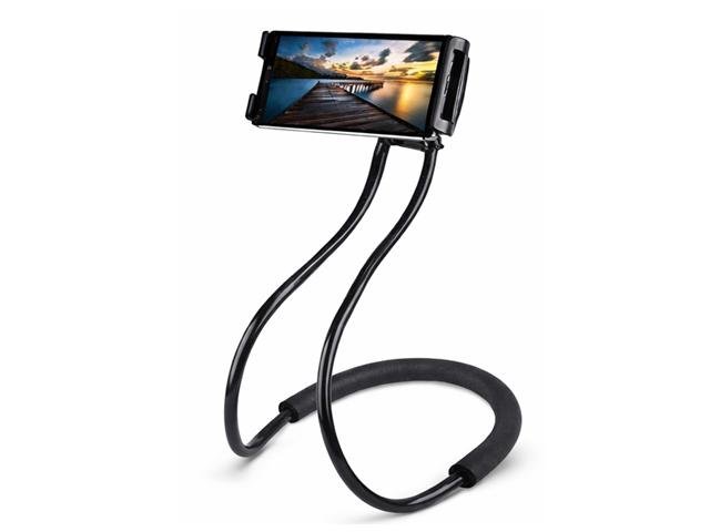 Flexible hands-free neck mobile holder designed for comfortable smartphone viewing without holding the device. The dual reinforced gooseneck arms provide adjustable positioning, while the soft foam neck support ensures comfort. Suitable for watching movies, online meetings, reading, gaming, and video calls at home or office.