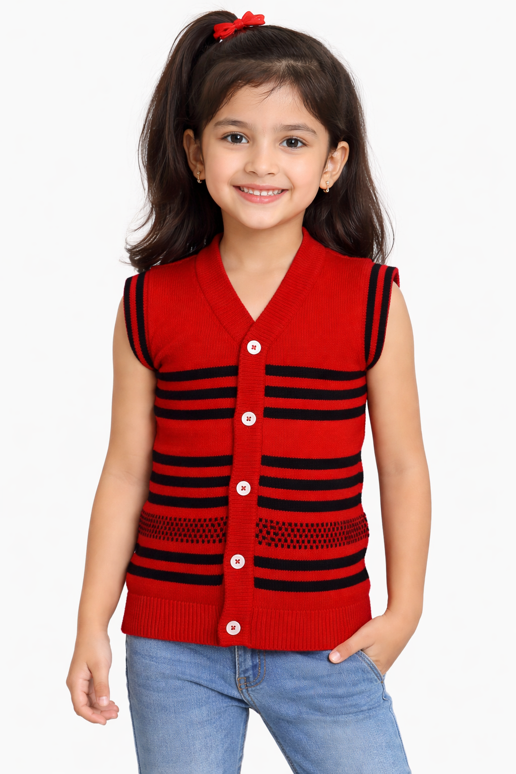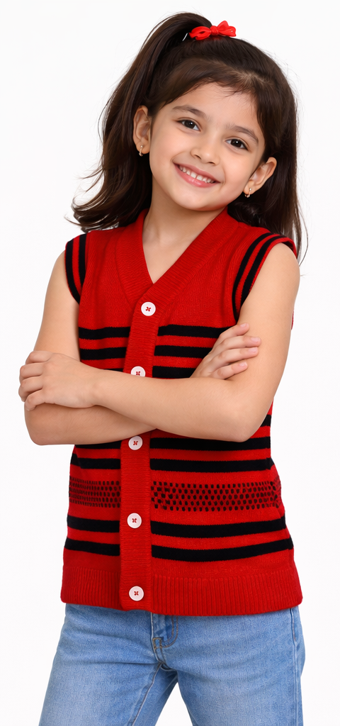 This handmade woolen sleeveless sweater is specially designed for kids aged 3 to 6 years. Made using pure wool, it provides excellent warmth while remaining soft and comfortable on delicate skin. The attractive red and black striped design, V-neck style, and front button closure make it easy to wear and perfect for winter daily use, outings, and casual occasions. Slight variations may occur as the product is handmade.