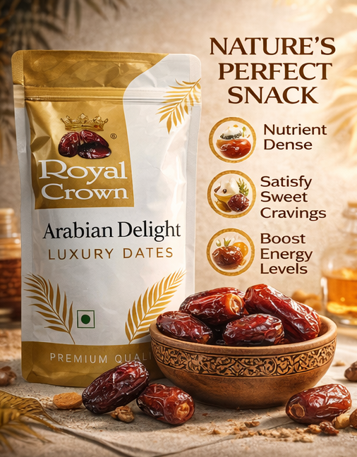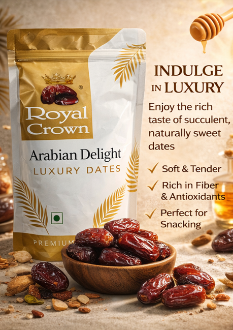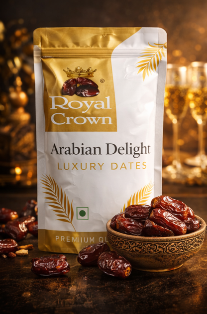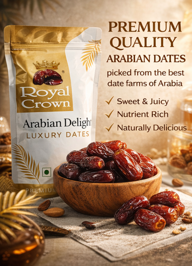 Royal Crown Arabian Delight Luxury Dates offer premium quality, naturally sweet and juicy dates packed with essential nutrients. Perfect for healthy snacking, gifting, or daily energy needs. Hygienically packed to preserve freshness and taste.