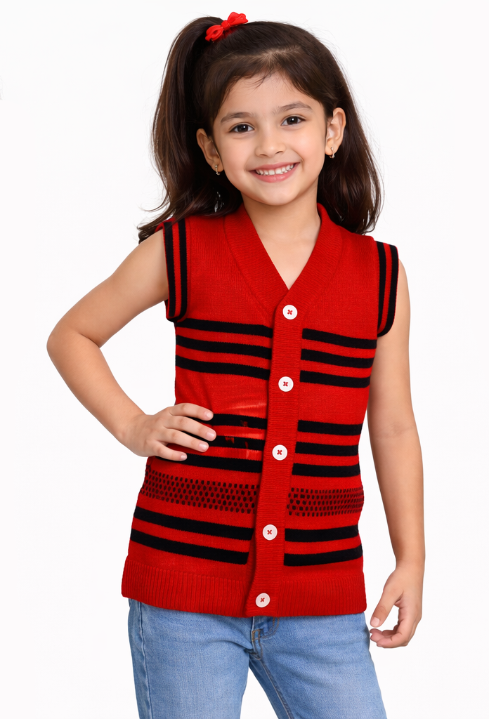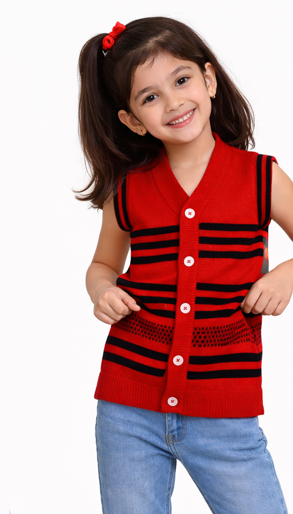 This handmade woolen sleeveless sweater is specially designed for kids aged 3 to 6 years. Made using pure wool, it provides excellent warmth while remaining soft and comfortable on delicate skin. The attractive red and black striped design, V-neck style, and front button closure make it easy to wear and perfect for winter daily use, outings, and casual occasions. Slight variations may occur as the product is handmade.