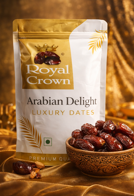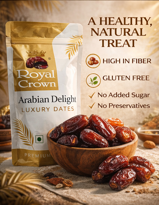 Royal Crown Arabian Delight Luxury Dates offer premium quality, naturally sweet and juicy dates packed with essential nutrients. Perfect for healthy snacking, gifting, or daily energy needs. Hygienically packed to preserve freshness and taste.